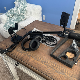 New everything: comfy chairs (review coming), footstools, headphones, new recording platform, and our shiny logo. We spent hours cabling and testing; we both fought with mics and laughed a lot.